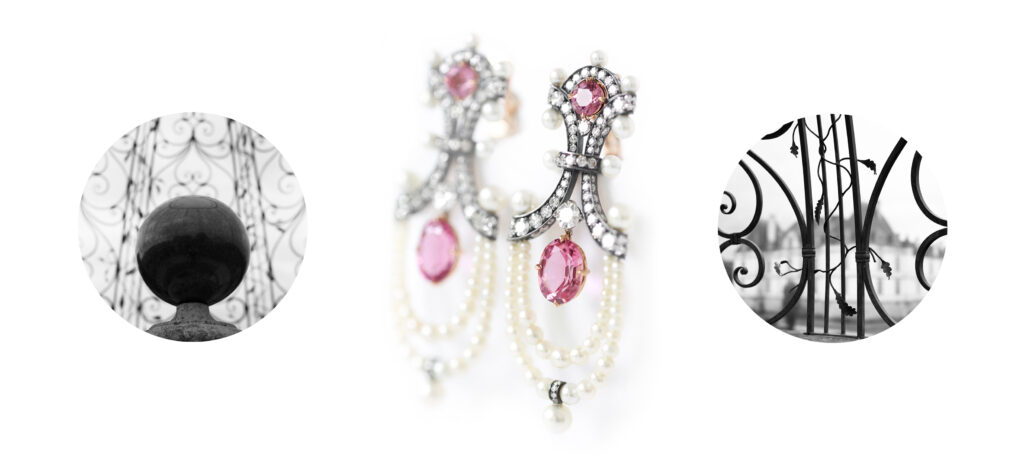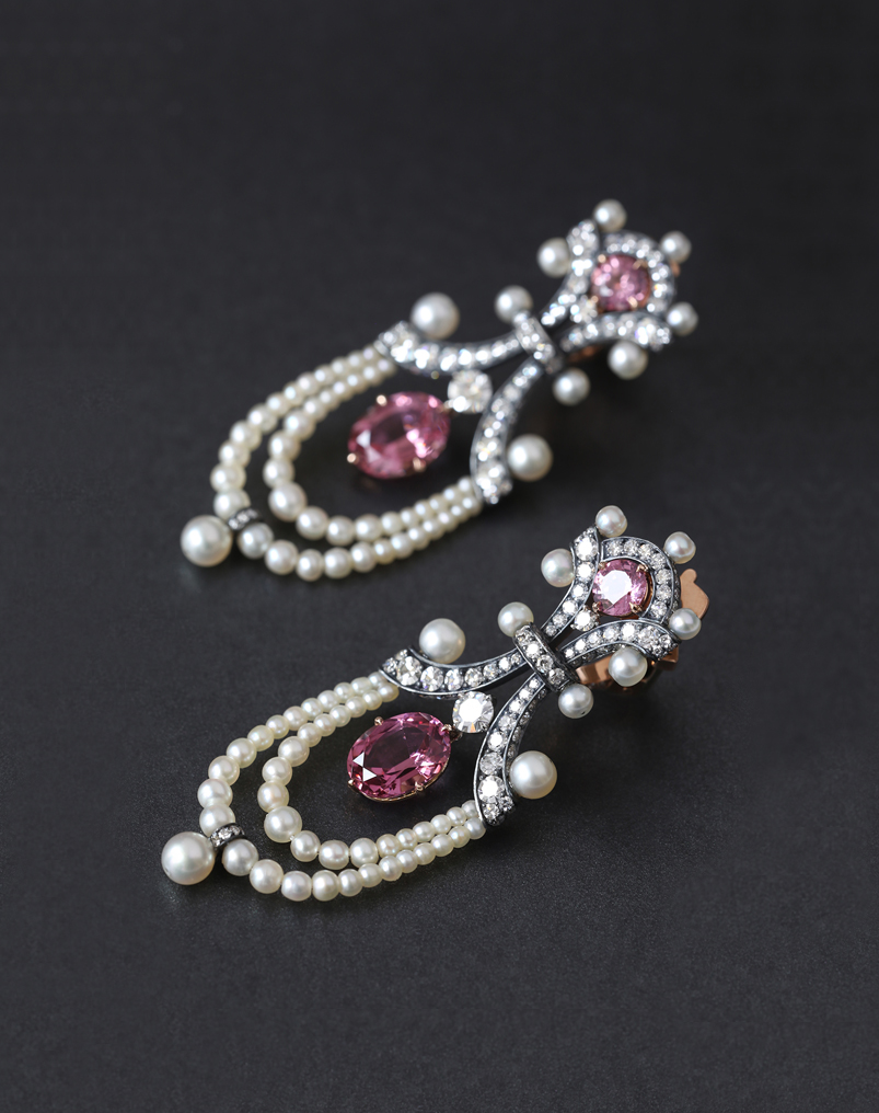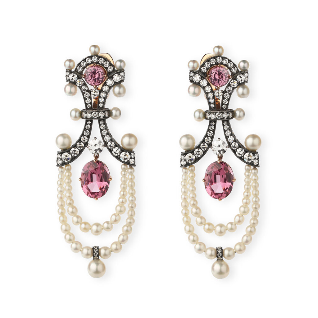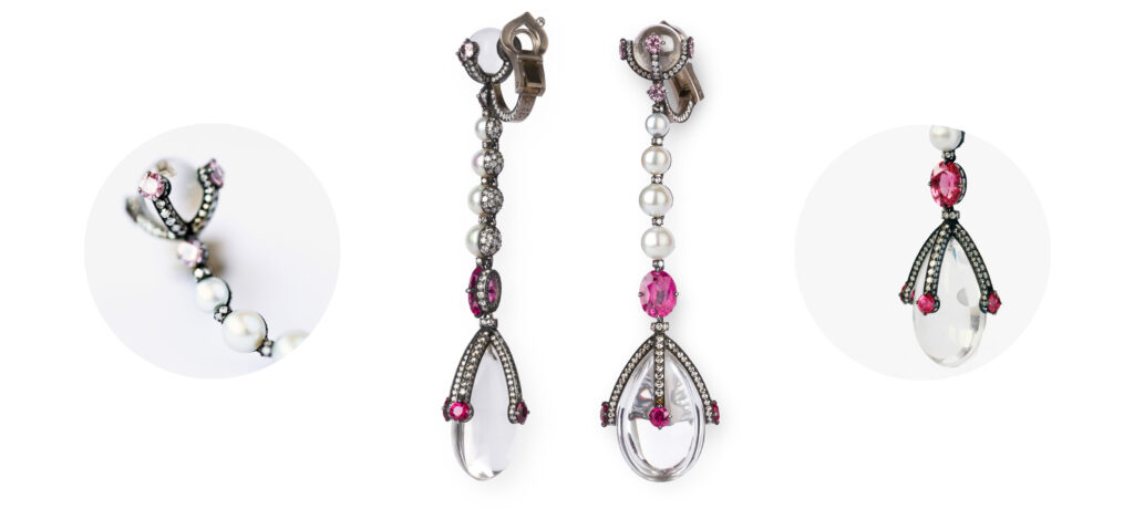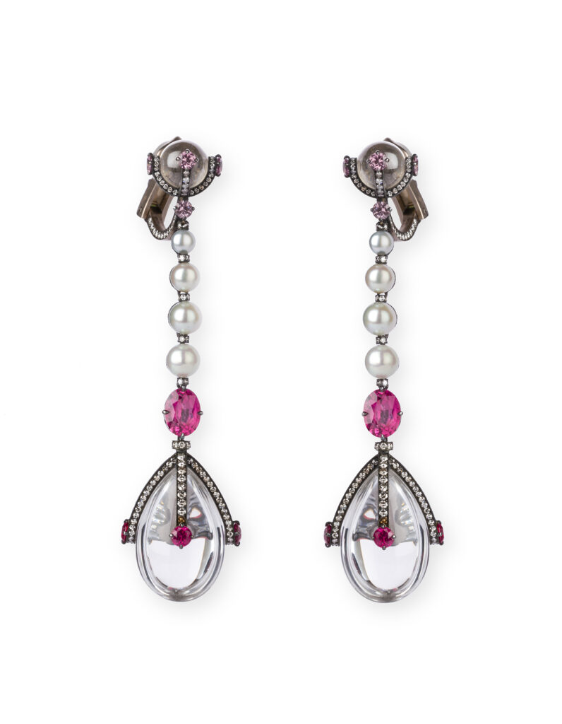 Rock crystal balls and drops connected by a gradient of fine pearls, contrasting bold earrings that assert their strong character, shades of black and white enhanced by the intense pink of spinels.
